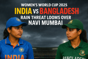 As the Women’s World Cup 2025 group stage nears its end, all eyes turn to Navi Mumbai where India face Bangladesh in what could be a rain-affected encounter. Dark clouds hover over DY Patil Stadium, with heavy showers predicted throughout Sunday. Still, both teams will be eager to make a mark before the semifinals begin.